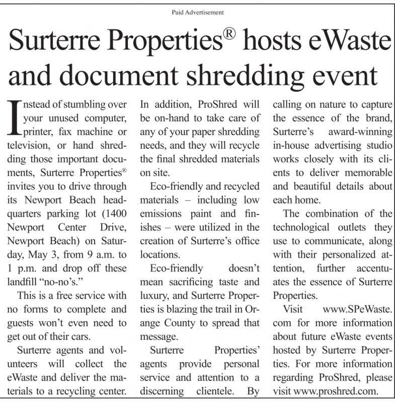 of stumbling over your unused computer, printer, fax machine or television, or hand shredding those important documents, Surterre Properties ® invites you to drive through its Newport Beach headquarters parking lot (1400 Newport Center Drive, Newport Beach) on Saturday, May 3, from 9 a.m. to 1 p.m. and drop off these landfill “no-no’s.”