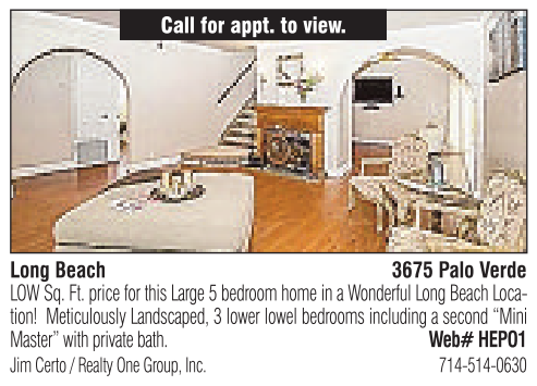 Long Beach Call for appt. to view. 3675 Palo Verde LOWSq. Ft. price for this Large5bedroom home in aWonderful Long Beach Location! Meticulously Landscaped, 3lower lowel bedrooms including asecond “Mini Master” with private bath. Web# HEPO1 Jim Certo /Realty One Group, Inc. 714-514-0630