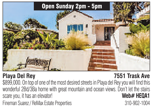 Playa Del Rey Open Sunday 2pm -5pm 7551 Trask Ave Fineman Suarez /ReMax Estate Properties 310-902-1004 $899,000. On top of one of the most desired streets in Playa del Reyyou will find this wonderful 2Bd/3Ba home with great mountain and ocean views. Don’t let the stairs scareyou, it has an elevator! Web# HEQA1 See also