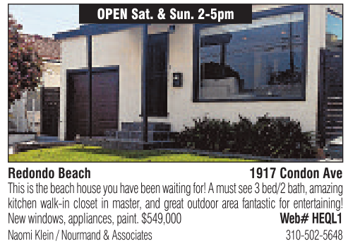 Redondo Beach OPEN Sat. &Sun. 2-5pm 1917 Condon Ave Naomi Klein /Nourmand &Associates 310-502-5648 This is the beach house you have been waiting for! Amust see 3bed/2 bath, amazing kitchen walk-in closet in master, and great outdoor area fantastic for entertaining! New windows, appliances, paint. $549,000 Web# HEQL1