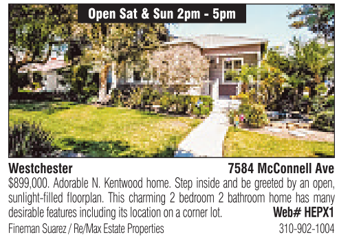 Westchester Open Sat &Sun 2pm -5pm 7584 McConnell Ave $899,000. Adorable N. Kentwood home. Step inside and be greeted by an open, sunlight-filled floorplan. This charming 2bedroom 2bathroom home has many desirable features including its location on acorner lot. Web# HEPX1 Fineman Suarez /Re/Max Estate Properties 310-902-1004
