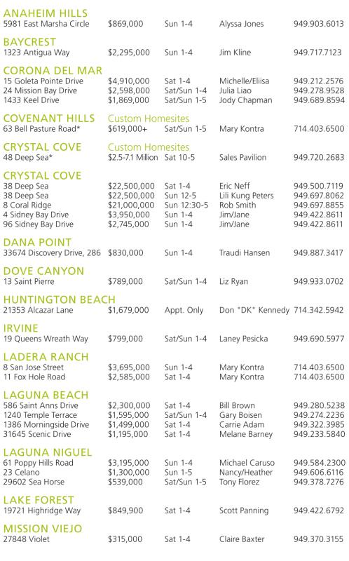ANAHEIM HILLS 5981 East Marsha Circle $869,000 Sun 1-4 Alyssa Jones 949.903.6013 BAYCREST 1323 Antigua Way $2,295,000 Sun 1-4 Jim Kline 949.717.7123 CORONA DEL MAR 15 Goleta Pointe Drive $4,910,000 Sat 1-4 Michelle/Eliisa 949.212.2576 24 Mission Bay Drive $2,598,000 Sat/Sun 1-4 Julia Liao 949.278.9528 1433 Keel Drive $1,869,000 Sat/Sun 1-5 Jody Chapman 949.689.8594 COVENANT HILLS Custom Homesites 63 Bell Pasture Road* $619,000+ Sat/Sun 1-5 Mary Kontra 714.403.6500 CRYSTAL COVE Custom Homesites 48 Deep Sea* $2.5-7.1Million Sat 10-5 Sales Pavilion 949.720.2683 CRYSTAL COVE 38 Deep Sea $22,500,000 Sat 1-4 Eric Neff 949.500.7119 38 Deep Sea $22,500,000 Sun 12-5 Lili Kung Peters 949.697.8062 8 Coral Ridge $21,000,000 Sun 12:30-5 Rob Smith 949.697.8855 4 Sidney Bay Drive $3,950,000 Sun 1-4 Jim/Jane 949.422.8611 96 Sidney Bay Drive $2,745,000 Sun 1-4 Jim/Jane 949.422.8611 DANA POINT 33674 Discovery Drive, 286 $830,000 Sun 1-4 Traudi Hansen 949.887.3417 DOVE CANYON 13 Saint Pierre $789,000 Sat/Sun 1-4 Liz Ryan 949.933.0702 HUNTINGTON BEACH 21353 Alcazar Lane $1,679,000 Appt. Only Don "DK" Kennedy 714.342.5942 IRVINE 19 Queens Wreath Way $799,000 Sat/Sun 1-4 Laney Pesicka 949.690.5977 LADERA RANCH 8 San Jose Street $3,695,000 Sun 1-4 Mary Kontra 714.403.6500 11 Fox Hole Road $2,585,000 Sat 1-4 Mary Kontra 714.403.6500 LAGUNA BEACH 586 Saint Anns Drive $2,300,000 Sat 1-4 Bill Brown 949.280.5238 1240 Temple Terrace $1,595,000 Sat/Sun 1-4 Gary Boisen 949.274.2236 1386 Morningside Drive $1,499,000 Sat 1-4 Carrie Adam 949.322.3985 31645 Scenic Drive $1,195,000 Sat 1-4 Melane Barney 949.233.5840 LAGUNA NIGUEL 61 Poppy Hills Road $3,195,000 Sun 1-4 Michael Caruso 949.584.2300 23 Celano $1,300,000 Sun 1-5 Nancy/Heather 949.606.6116 29602 Sea Horse $539,000 Sat/Sun 1-5 Tony Florez 949.378.7276 LAKE FOREST 19721 Highridge Way $849,900 Sat 1-4 Scott Panning 949.422.6792 MISSION VIEJO 27848 Violet $315,000 Sat 1-4 Claire Baxter 949.370.3155