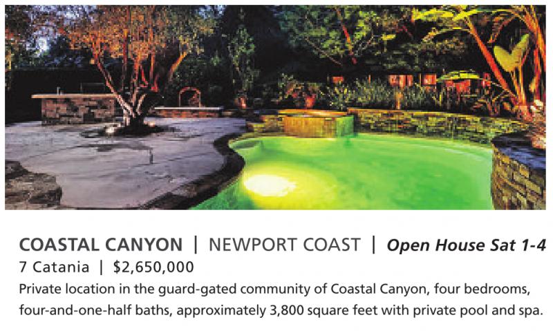 COASTAL CANYON | NEWPORT COAST | Open House Sat 1-4 7 Catania | $2,650,000 Private location in the guard-gated community of Coastal Canyon, four bedrooms, four-and-one-half baths, approximately 3,800 square feet with private pool and spa.