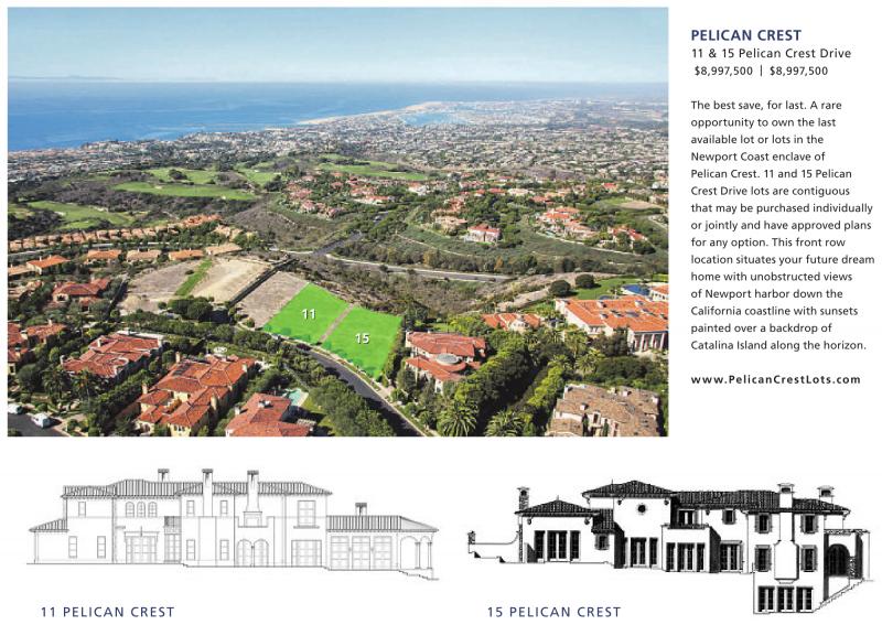 11 11 15 15 PELICAN CREST 11 & 15 Pelican Crest Drive $8,997,500 | $8,997,500 The best save, for last. A rare opportunity to own the last available lot or lots in the Newport Coast enclave of Pelican Crest. 11 and 15 Pelican Crest Drive lots are contiguous that may be purchased individually or jointly and have approved plans for any option. This front row location situates your future dream home with unobstructed views of Newport harbor down the California coastline with sunsets painted over a backdrop of Catalina Island along the horizon. www.PelicanCrestLots.com 11 PELICAN CREST 15 PELICAN CREST