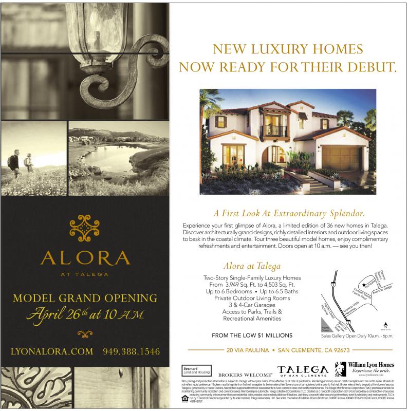 NEW LUXURY HOMES NOW READY FOR THEIR DEBUT. A First Look At Extraordinary Splendor. Experience your first glimpse of Alora, a limited edition of 36 new homes in Talega. Discoverarchitecturallygranddesigns,richlydetailedinteriorsandoutdoorlivingspaces to bask in the coastal climate. Tour three beautiful model homes, enjoy complimentary refreshments and entertainment. Doors open at 10 a.m. —see you then! MODEL GRAND OPENING April 26 th at 10 A.M. Alora at Talega Two-Story Single-Family Luxury Homes From 3,949 Sq. Ft. to 4,503 Sq. Ft. Up to 6 Bedrooms • Up to 6.5 Baths Private Outdoor Living Rooms 3 & 4-Car Garages Access to Parks, Trails & Recreational Amenities FROM THE LOW $1 MILLIONS N MAP NOT TO SCALE Sales Gallery Open Daily 10a.m. -6p.m. LYONALORA.COM 949.388.1546 20 VIA PAULINA • SAN CLEMENTE, CA 92673 BROKERS WELCOME* Plan, pricing and production information is subject to change without prior notice. Price effectiveasofdateofpublication. Rendering and map areanartist conception and arenot to scale. Models do notreflect racial preference. *Brokers must bring client on first visit to register forbrokerreferral fee. Buyers cannotberegistered online prior to first visit. Broker referral feetobepaid at the close of escrow. Talega is governed by aHome Owners Association supportedbyowner assessments to fund common area and facility maintenance. TheTalega Maintenance Corporation (TMC) provides avehicle for maintaining community recreation and common areas. Membership is automatic. Talega Lifestyle Corporations (TLC) created as anonprofit corporation (501c4) is funded by acombination of sources, including community enhancement fees on residential sales, resales and nondeductible contributions, user fees, corporatealliances and partnerships, event fund raising and endowments. TLCis run by aBoardofDirectors appointed by its sole member,Talega Associates, LLC. See sales counselors fordetails. Donna Boatman, CalBRE license #00461333 and Cyndi Ferrari, CalBRE license #01148757.