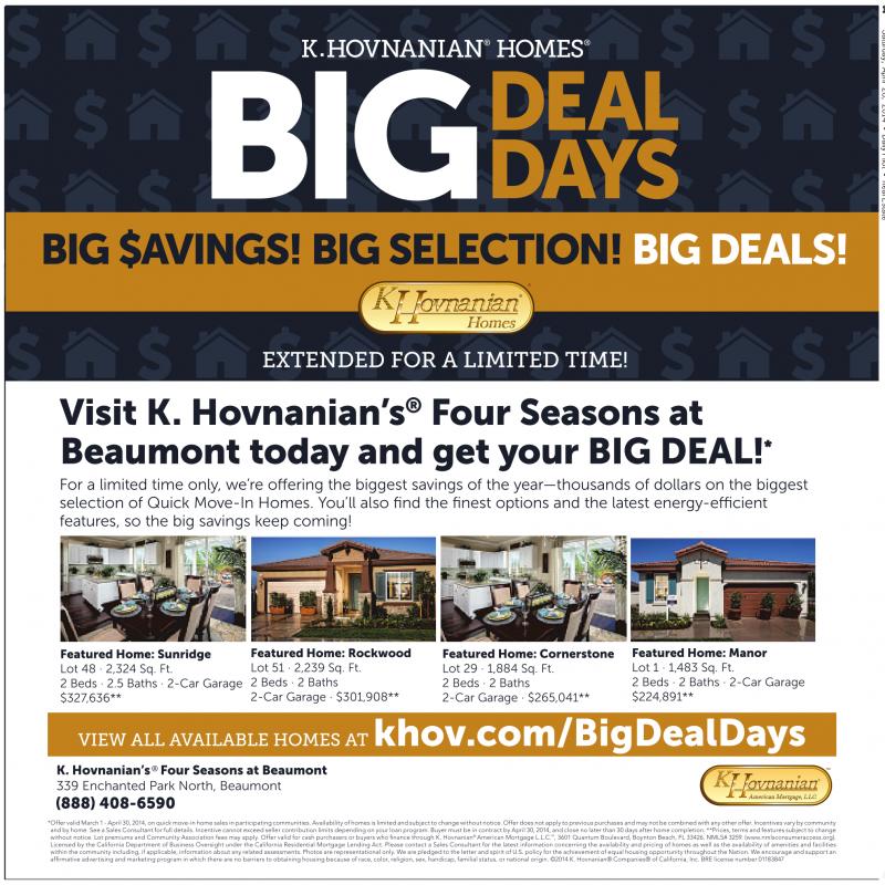*Offer validMarch 1-April 30,2014, on quickmove-inhome salesinparticipating communities. Availability of homes is limitedand subject to change withoutnotice. Offerdoesnot apply to previous purchasesand maynot be combined with anyother offer. Incentives varybycommunity and by home. SeeaSalesConsultantfor full details. Incentivecannot exceed seller contribution limits depending on your loanprogram. BuyermustbeincontractbyApril 30,2014, and close no laterthan30daysafter homecompletion. **Prices,terms and featuressubject to change without notice. Lot premiums and Community Association fees may apply. Offer valid for cash purchasers orbuyers who finance through K. Hovnanian ® American Mortgage L.L.C. ™ ,3601 Quantum Boulevard, Boynton Beach, FL33426. NMLS# 3259. (www.nmlsconsumeraccess.org). Licensed by the California Department ofBusiness Oversight under the California Residential Mortgage Lending Act. Please contact aSales Consultant for the latest information concerning the availability and pricing of homes as well asthe availability of amenities and facilities within thecommunityincluding, if applicable,information aboutany relatedassessments.Photosare representational only.Weare pledged to theletterand spirit of U.S. policy forthe achievementofequal housing opportunity throughout theNation.Weencourageand supportan affirmative advertising and marketing program inwhich there are nobarriers toobtaining housing because of race, color, religion, sex, handicap, familial status, ornational origin. ©2014 K. Hovnanian® Companies® of California, Inc. BRE license number 01183847