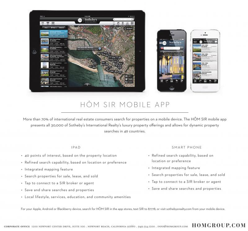 For your Apple, Android or Blackberry device, search for HÔM SIR in the app stores, text SIR to 87778, or visit sothebysrealty.com from your mobile device.