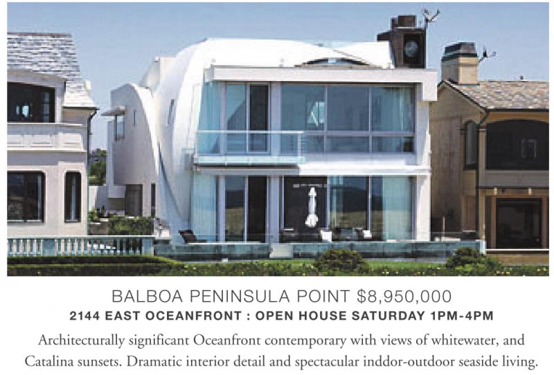 BALBOA PENINSULA POINT $8,950,000 2144 EAST OCEANFRONT : OPEN HOUSE SATURDAY 1PM-4PM Architecturally significant Oceanfront contemporary with views of whitewater, and Catalina sunsets. Dramatic interior detail and spectacular inddor-outdoor seaside living.