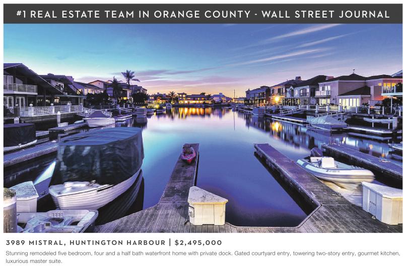 # 1 R E A L E STAT E T E A M I N O RA N G E CO U N T Y - WA L L ST R E E T J O U R N A L 3989 MISTRAL, HUNTINGTON HARBOUR | $2,495,000 Stunning remodeled five bedroom, four and a half bath waterfront home with private dock. Gated courtyard entry, towering two-story entry, gourmet kitchen, luxurious master suite.