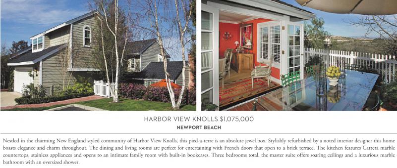 HARBOR VIEW KNOLLS $1,075,000 NEWPORT BEACH Nestled in the charming New England styled community of Harbor View Knolls, this pied-a-terre is an absolute jewel box. Stylishly refurbished by a noted interior designer this home boasts elegance and charm throughout. The dining and living rooms are perfect for entertaining with French doors that open to a brick terrace. The kitchen features Carrera marble countertops, stainless appliances and opens to an intimate family room with built-in bookcases. Three bedrooms total, the master suite offers soaring ceilings and a luxurious marble bathroom with an oversized shower.