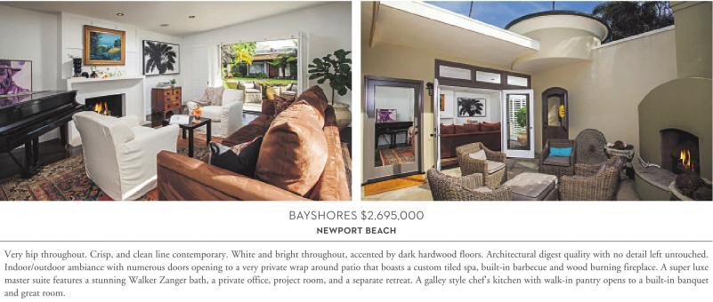 BAYSHORES $2,695,000 NEWPORT BEACH Very hip throughout. Crisp, and clean line contemporary. White and bright throughout, accented by dark hardwood floors. Architectural digest quality with no detail left untouched. Indoor/outdoor ambiance with numerous doors opening to a very private wrap around patio that boasts a custom tiled spa, built-in barbecue and wood burning fireplace. A super luxe master suite features a stunning Walker Zanger bath, a private office, project room, and a separate retreat. A galley style chef's kitchen with walk-in pantry opens to a built-in banquet and great room.