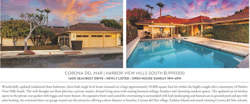CORONA DEL MAR | HARBOR VIEW HILLS SOUTH $1,999,000 1400 SEACREST DRIVE : NEWLY LISTED : OPEN HOUSE SUNDAY 1PM-4PM Wonderfully updated traditional three bedroom, three bath single level home situated on a large approximately 10,000 square foot lot within the highly sought after community of Harbor View Hills South. The well thought out floor plan has a private master, formal living areas with soaring beamed ceilings, fireplace and charming outdoor spaces. The updated eat-in kitchen opens to the private rear garden with loggia and water feature. An expansive front yard suited for entertaining is surrounded with lush landscaping and features an in-ground pool and spa with solar heating. An oversized three-car garage round out this attractive offering a short distance to beaches, Corona del Mar village, Fashion Island and award winning Corona del Mar schools.