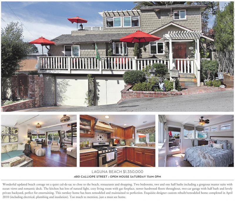 33 LAGUNA BEACH $1,350,000 480 CALLIOPE STREET : OPEN HOUSE SATURDAY 11AM-3PM Wonderful updated beach cottage on a quiet cul-de-sac so close to the beach, restaurants and shopping. Two bedrooms, two and one half baths including a gorgeous master suite with ocean views and romantic deck. The kitchen has lots of natural light, cozy living room with gas fireplace, newer hardwood floors throughout, two-car garage with half bath and lovely private backyard, perfect for entertaining. This turnkey home has been remodeled and maintained to perfection. Exquisite designer custom rebuilt/remodeled home completed in April 2010 (including electrical, plumbing and insulation). Too much to mention, just a must see home.