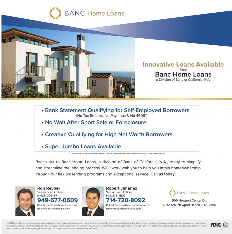 ©2014 Banc of California, National Association, dba Banc Home Loans. All rights reserved. Not all applicants will qualify. Some products offered by Banc Home Loans include modified documentation requirements and may have ahigher interest rate, more points or more fees than other products requiring documentation. Minimum FICO, reserve, and other requirements apply. Contact your Loan Officer for additional program guidelines, restrictions, and eligibility requirements. Rates, points, APR’s and programs are subject to change at any time until locked-in. NMLS #530611