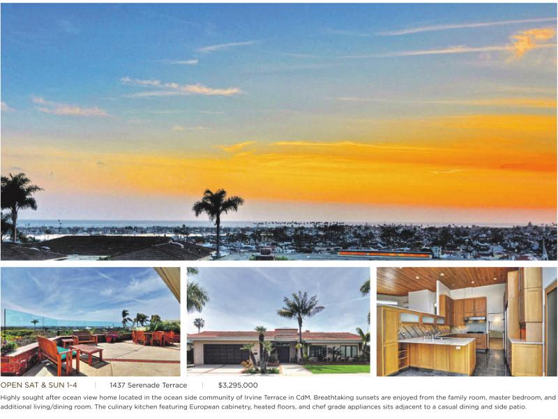 OPEN SAT & SUN 1-4 | 1437 Serenade Terrace | $3,295,000 Highly sought after ocean view home located in the ocean side community of Irvine Terrace in CdM. Breathtaking sunsets are enjoyed from the family room, master bedroom, and additional living/dining room. The culinary kitchen featuring European cabinetry, heated floors, and chef grade appliances sits adjacent to a casual dining and side patio.