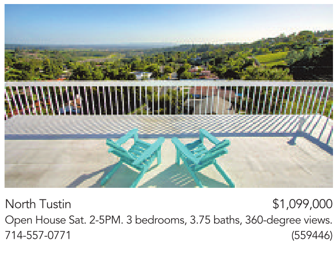 North Tustin $1,099,000 Open House Sat. 2-5PM. 3bedrooms, 3.75 baths, 360-degree views. 714-557-0771 (559446)