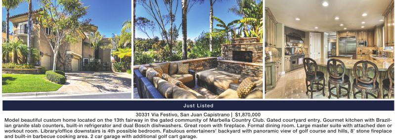 Just Listed 30331 Via Festivo, San Juan Capistrano | $1,870,000 Model beautiful custom home located on the 13th fairway in the gated community of Marbella Country Club. Gated courtyard entry. Gourmet kitchen with Brazilian granite slab counters, built-in refrigerator and dual Bosch dishwashers. Great room with fireplace. Formal dining room. Large master suite with attached den or workout room. Library/office downstairs is 4th possible bedroom. Fabulous entertainers’ backyard with panoramic view of golf course and hills, 8’ stone fireplace and built-in barbecue cooking area. 2 car garage with additional golf cart garage. See also