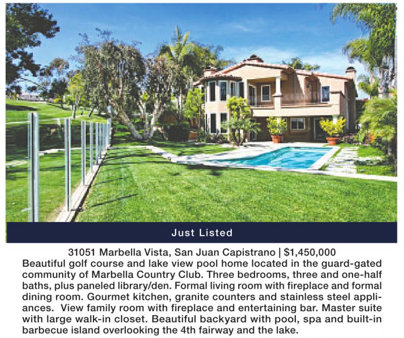 Just Listed 31051 Marbella Vista, San Juan Capistrano | $1,450,000 Beautiful golf course and lake view pool home located in the guard-gated community of Marbella Country Club. Three bedrooms, three and one-half baths, plus paneled library/den. Formal living room with fireplace and formal dining room. Gourmet kitchen, granite counters and stainless steel appliances. View family room with fireplace and entertaining bar. Master suite with large walk-in closet. Beautiful backyard with pool, spa and built-in barbecue island overlooking the 4th fairway and the lake. See also