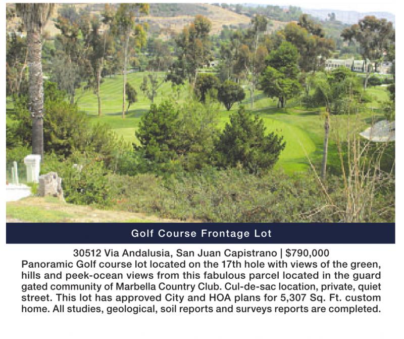 Golf Course Frontage Lot 30512 Via Andalusia, San Juan Capistrano | $790,000 Panoramic Golf course lot located on the 17th hole with views of the green, hills and peek-ocean views from this fabulous parcel located in the guard gated community of Marbella Country Club. Cul-de-sac location, private, quiet street. This lot has approved City and HOA plans for 5,307 Sq. Ft. custom home. All studies, geological, soil reports and surveys reports are completed.