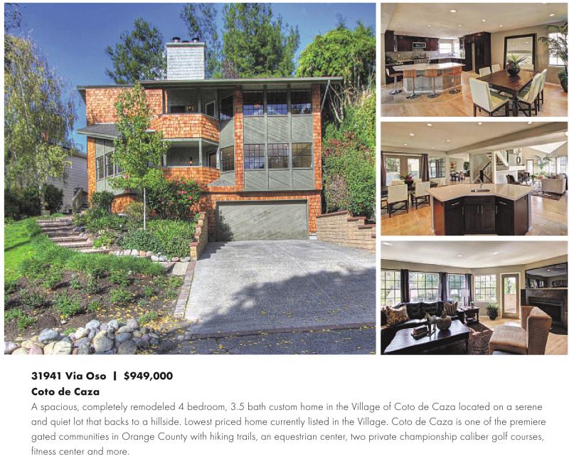 31941 Via Oso | $949,000 Coto de Caza A spacious, completely remodeled 4 bedroom, 3.5 bath custom home in the Village of Coto de Caza located on a serene and quiet lot that backs to a hillside. Lowest priced home currently listed in the Village. Coto de Caza is one of the premiere gated communities in Orange County with hiking trails, an equestrian center, two private championship caliber golf courses, fitness center and more.