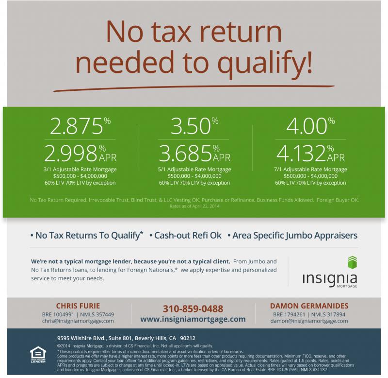 ©2014 Insignia Mortgage, a division of CS Financial, Inc. Not all applicants will qualify. *These products require other forms of income documentation and asset verification in lieu of tax returns. Some products we offer may have ahigher interest rate, more points or more fees than other products requiring documentation. Minimum FICO, reserve, and other requirements apply. Contact your loan officer for additional program guidelines, restrictions, and eligibility requirements. Rates quoted at 1.5 points. Rates, points and APRs and programs are subject to change at any time until locked-in. LTVs are based on appraised value. Actual closing times will vary based on borrower qualifications and loan terms. Insignia Mortgage is adivision of CS Financial, Inc., abroker licensed by the CA Bureau of Real Estate BRE #01257559 |NMLS #31132