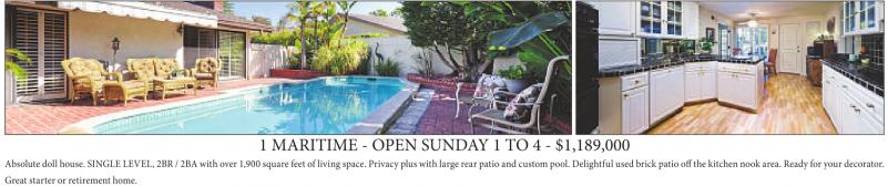 1 MARITIME - OPEN SUNDAY 1 TO 4 - $1,189,000 Absolutedollhouse. SINGLE LEVEL, 2BR/2BA with over1,900 square feet of living space. Privacypluswithlarge rear patioand custompool. Delightful used brickpatio off thekitchen nook area.Ready for your decorator. Greatstarter or retirement home.
