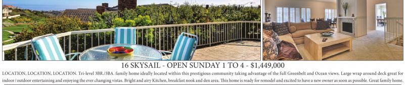 16 SKYSAIL - OPEN SUNDAY 1 TO 4 - $1,449,000 LOCATION, LOCATION, LOCATION. Tri-level 3BR./3BA. family home ideally located within this prestigious community taking advantage of the full Greenbelt and Ocean views. Large wrap around deck great for indoor/outdoor entertaining andenjoyingthe ever changing vistas.Brightand airy Kitchen, breakfastnookand den area.This homeisready for remodel andexcited to have anew ownerassoonaspossible.Great family home.