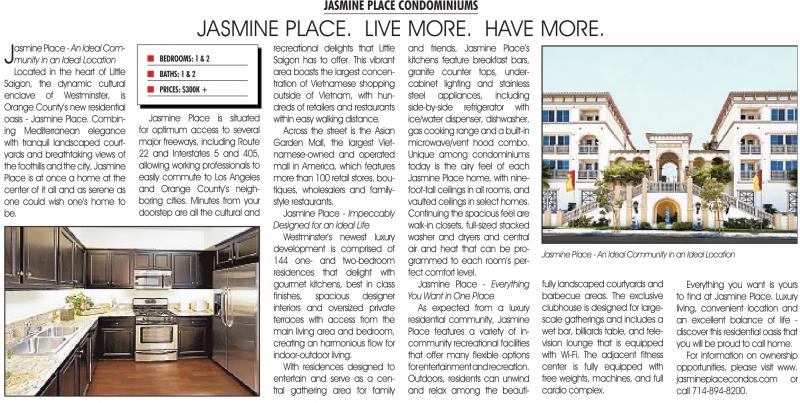 Place - An Ideal Community in an Ideal Location Located in the heart of Little Saigon, the dynamic cultural enclave of Westminster, is Orange County’s new residential oasis - Jasmine Place. Combining Mediterranean elegance with tranquil landscaped courtyards and breathtaking views of the foothills and the city, Jasmine Place is at once a home at the center of it all and as serene as one could wish one’s home to be.