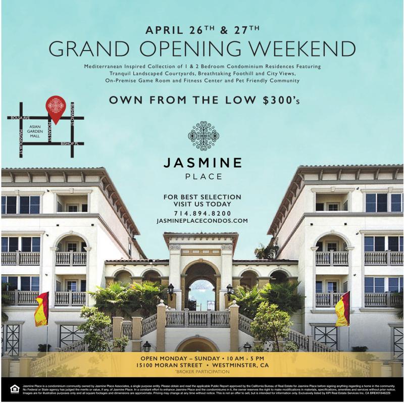 OPEN MONDAY – SUNDAY • 10 AM - 5 PM 15100 MORAN STREET • WESTMINSTER, CA * BROKER PARTICIPATION Jasmine Place is acondominium community owned by Jasmine Place Associates, asingle purpose entity.Please obtain and read the applicable Public Report approved by the California Bureau of Real Estate for Jasmine Place beforesigning anything regarding ahome in the community.