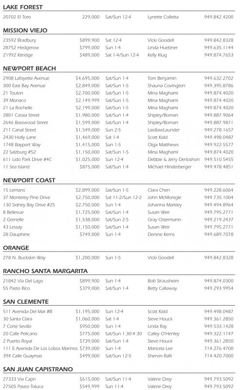 newport Beach 2908 Lafayette Avenue $4,695,000 Sat/Sun 1-4 TomBenjamin 949.632.2702 300 East Bay Avenue $2,849,000 Sat/Sun 1-5 Shauna Covington 949.395.8786 21 Toulon $2,700,000 Sat/Sun 1-5 Mina Maghami 949.874.4020 39 Monaco $2,149,999 Sat/Sun 1-5 Mina Maghami 949.874.4020 21 La Rochelle $2,199,000 Sat/Sun 1-5 Mina Maghami 949.874.4020 2801 Cassia Street $1,980,000 Sat/Sun 1-4 Shipley/Boman 949.887.9064 2646 Basswood Street $1,599,000 Sat/Sun 1-4 Shipley/Boman 949.887.9871 211 Canal Street $1,549,000 Sun 2-5 LaidlawLaunder 949.278.1657 2430 Holly Lane $1,469,000 Sat 1-4 Scott Kidd 949.498.0487 1748 Bayport Way $1,415,000 Sun 1-5 Olga Matthews 949.922.5577 22 Salzburg #52 $1,150,000 Sat/Sun 1-5 Mina Maghami 949.874.4020 611 Lido Park Drive #4C $1,025,000 Sun 12-4 Debbie &Jerry Derloshon 949.510.5455 11 Sea Island $875,000 Sat/Sun 1-4 Michael Hinderberger 949.478.4851 newport coast 15 Lemans $2,899,000 Sat/Sun 1-5 Clara Chen 949.228.6064 37 Monterey Pine Drive $2,750,000 Sat 11-2/Sun 12-2 John McMonigle 949.735.1004 130 Sidney Bay Drive #25 $2,750,000 Sun 1-4 Johanna Markley 949.494.8964 8Bellevue $1,725,000 Sat/Sun 1-4 Susan Weir 949.795.2771 2Grenelle $1,538,000 Sat/Sun 2-5 Gray Ostermann 949.219.2437 43 Lessay $1,150,000 Sat/Sun 1-4 Susan Weir 949.795.2771 28 Dauphine $749,000 Sun 1-4 Denine Kerns 949.689.7078 orange 278 N. Buckskin Way $1,200,000 Sun 1-5 Vicki Goodell 949.842.8328 rancho santa Margarita 21842 Via Del Lago $899,900 Sun 1-4 Bob Strausheim 949.874.0300 55 Pasto Rico $379,000 Sat/Sun 1-4 Betty Callaway 949.293.9954 san cLeMente 511 Avenida Del Mar #B $1,195,000 Sun 12-4 Scott Kidd 949.498.0487 30 Santa Clara $1,060,000 Sat 1-4 Steve Houck 949.361.2850 7Corte Sevilla $950,000 Sun 1-4 Linda Ray 949.533.1428 20 Calle Pelicano $775,000 Sat/Sun 1:30-4:30 Calley O’Henley 949.322.1147 2Puerto Royal $739,000 Sat/Sun 1-4 Steve Houck 949.361.2850 111 EAvenida De Los Lobos Marinos $739,000 Sun 1-4 Maricela Lee 714.276.4700 394 Calle Guaymas $499,000 Sat/Sun 12-5 Shervin Rafii 714.420.7000