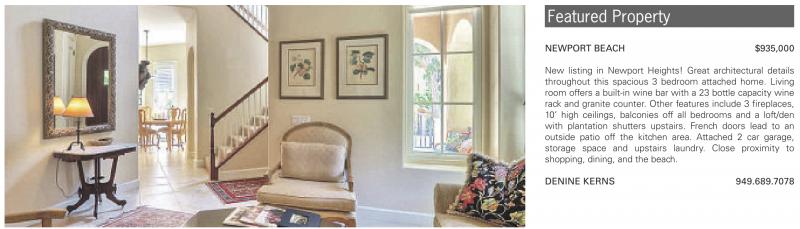 Featured Property NEWPORT BEACH $935,000 New listing in Newport Heights! Great architectural details throughout this spacious 3 bedroom attached home. Living room offers a built-in wine bar with a 23 bottle capacity wine rack and granite counter. Other features include 3 fireplaces, 10’ high ceilings, balconies off all bedrooms and a loft/den with plantation shutters upstairs. French doors lead to an outside patio off the kitchen area. Attached 2 car garage, storage space and upstairs laundry. Close proximity to shopping, dining, and the beach. DENINE KERNS 949.689.7078