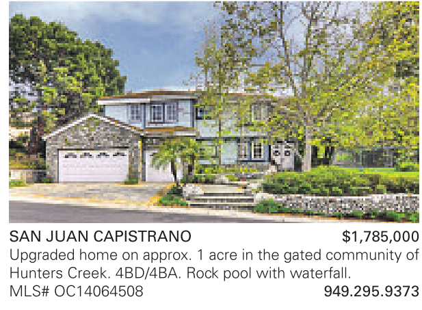SAN JUAN CAPISTRANO $1,785,000 Upgraded home on approx. 1 acre in the gated community of Hunters Creek. 4BD/4BA. Rock pool with waterfall. MLS# OC14064508 949.295.9373