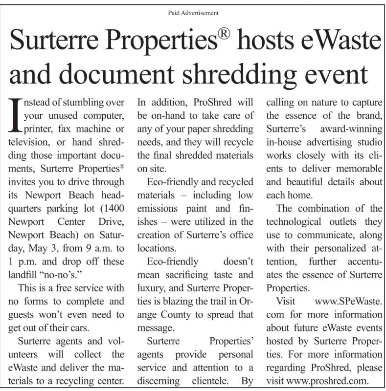 of stumbling over your unused computer, printer, fax machine or television, or hand shredding those important documents, Surterre Properties ® invites you to drive through its Newport Beach headquarters parking lot (1400 Newport Center Drive, Newport Beach) on Saturday, May 3, from 9 a.m. to 1 p.m. and drop off these landfill “no-no’s.”