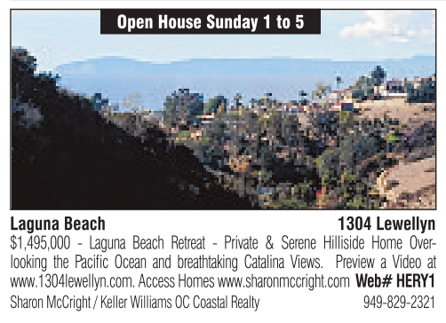 $1,495,000 - Laguna Beach Retreat - Private & Serene Hilliside Home Overlooking the Pacific Ocean and breathtaking Catalina Views. Preview a Video at www.1304lewellyn.com. Access Homes www.sharonmccright.com Web# HERY1 Sharon McCright /Keller Williams OC Coastal Realty 949-829-2321