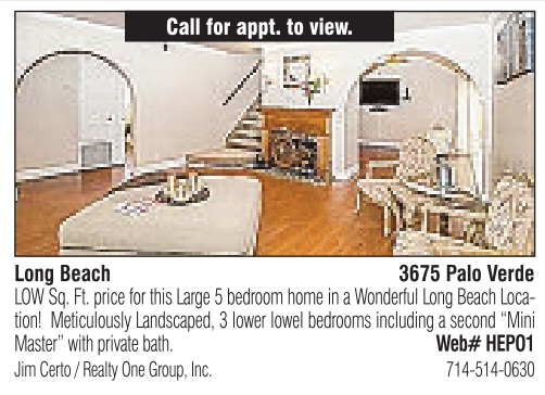 Call for appt. to view. Long Beach 3675 Palo Verde LOWSq. Ft. price for this Large5bedroom home in a Wonderful Long Beach Location! Meticulously Landscaped, 3lower lowel bedroomsincluding asecond “Mini Master” with private bath. Web# HEPO1 Jim Certo /Realty One Group, Inc. 714-514-0630