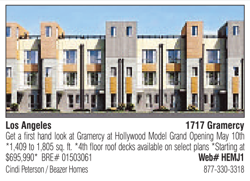 LosAngeles 1717 Gramercy Get afirst hand look at Gramercy at Hollywood Model Grand Opening May 10th *1,409 to 1,805 sq. ft. *4th floor roof decks available on select plans *Starting at $695,990* BRE# 01503061 Web# HEMJ1 Cindi Peterson /Beazer Homes 877-330-3318