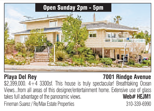 Open Sunday 2pm -5pm Playa Del Rey 7001 Rindge Avenue $2,399,000. 4+4 3300sf. This house is truly spectacular! Breathtaking Ocean Views...from all areas of this designer/entertainment home. Extensive use of glass takes full advantage of the panoramic views. Web# HEJM1 Fineman Suarez /Re/Max Estate Properties 310-339-6990 See also