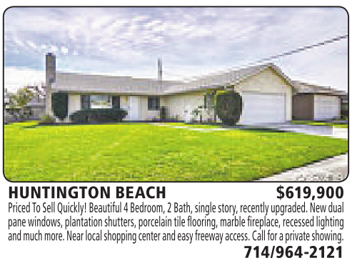 714/964-2121 HUNTINGTON BEACH $619,900 Priced To Sell Quickly!Beautiful4Bedroom, 2Bath, singlestory, recently upgraded. Newdual pane windows, plantation shutters, porcelain tile flooring,marble fireplace,recessedlighting andmuch more.Near localshoppingcenter and easy freeway access.Callfor aprivateshowing. 714/964-2121 See also