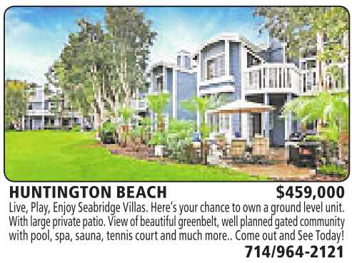 HUNTINGTON BEACH $459,000 Live, Play,Enjoy Seabridge Villas. Here’s your chancetoown aground level unit. With large privatepatio.Viewofbeautifulgreenbelt, well plannedgated community with pool, spa, sauna, tennis courtand muchmore.. Come outand See Today! 714/964-2121