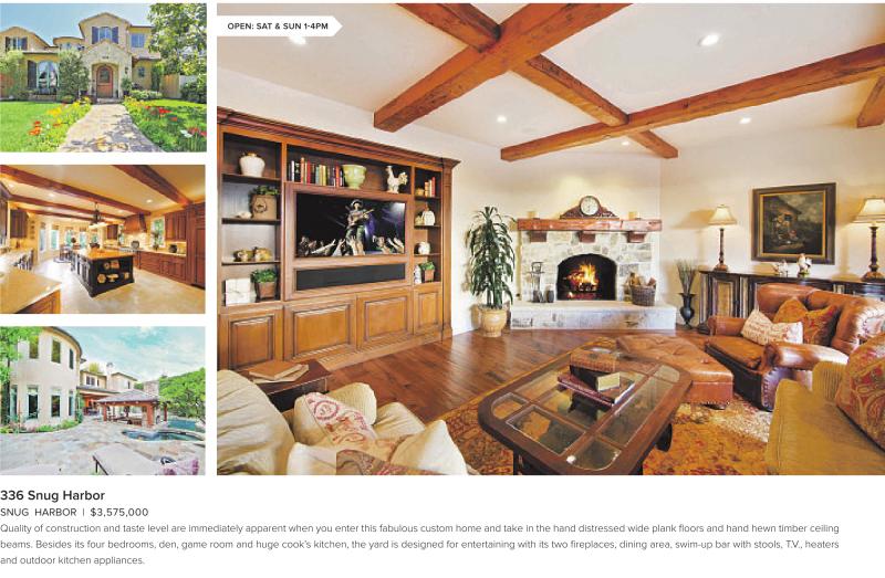 OPEN: SAT & SUN 1-4PM 336 Snug Harbor SNUG HARBOR | $3,575,000 Quality of construction and taste level are immediately apparent when you enter this fabulous custom home and take in the hand distressed wide plank floors and hand hewn timber ceiling beams. Besides its four bedrooms, den, game room and huge cook’s kitchen, the yard is designed for entertaining with its two fireplaces, dining area, swim-up bar with stools, T.V., heaters and outdoor kitchen appliances. See also