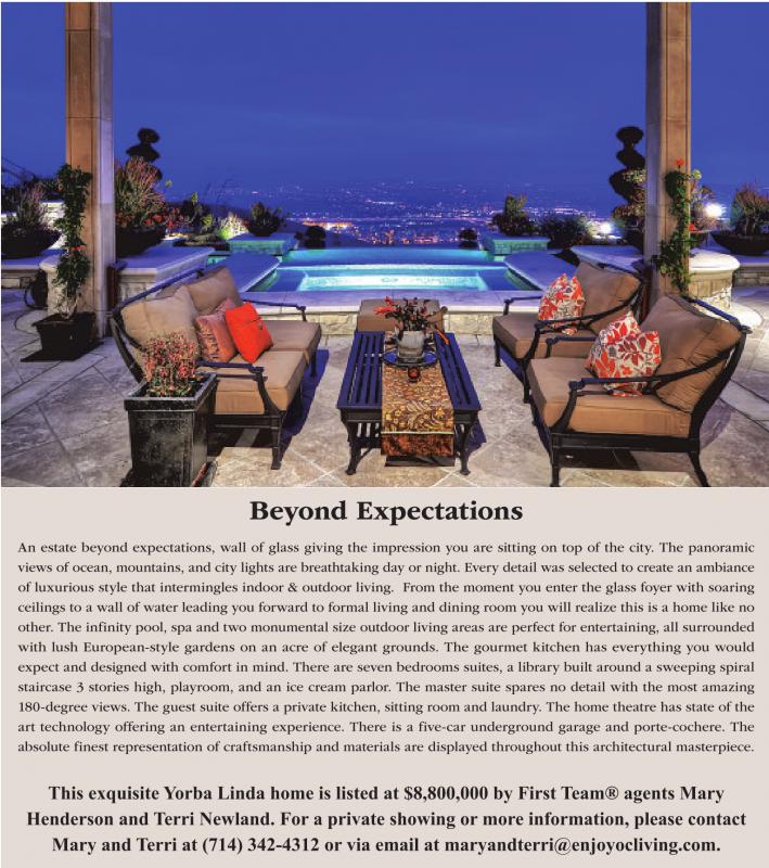 This exquisite Yorba Linda home is listed at $8,800,000 by First Team® agents Mary Henderson and Terri Newland. For a private showing or more information, please contact Mary and Terri at (714) 342-4312 or via email at maryandterri@enjoyocliving.com.