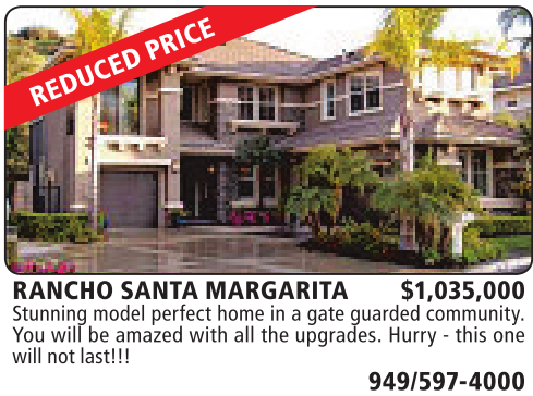 RANCHO SANTA MARGARITA $1,035,000 Stunning model perfect home inagate guarded community. You will be amazed with all the upgrades. Hurry -this one will notlast!!!