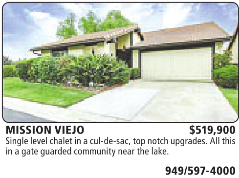 MISSION VIEJO $519,900 Single level chalet in acul-de-sac, topnotch upgrades. Allthis in agateguarded communitynear thelake.