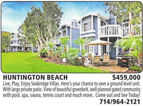 HUNTINGTON BEACH $459,000 Live, Play,Enjoy Seabridge Villas. Here’s your chancetoown aground level unit. With large privatepatio.Viewofbeautifulgreenbelt, well plannedgated community with pool, spa, sauna, tennis courtand muchmore.. Come outand See Today!