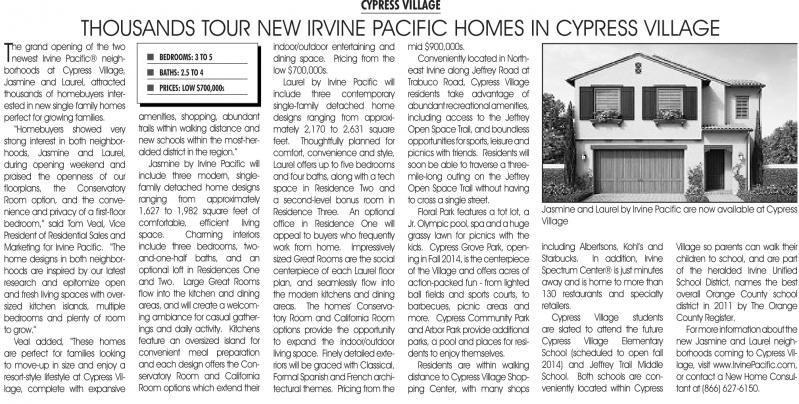 grand opening of the two newest irvine Pacific® neighborhoods at Cypress village, Jasmine and Laurel, attracted thousands of homebuyers interested in new single family homes perfect for growing families.