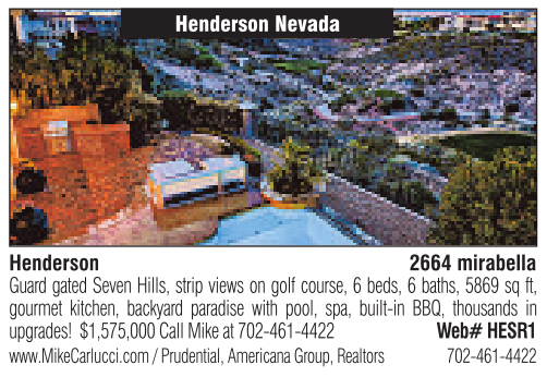 Guard gated Seven Hills, strip views on golf course, 6beds, 6baths, 5869 sq ft, gourmet kitchen, backyard paradise with pool, spa, built-in BBQ, thousands in upgrades! $1,575,000 Call Mike at 702-461-4422 Web# HESR1 Henderson Henderson Nevada 2664 mirabella www.MikeCarlucci.com /Prudential, Americana Group, Realtors 702-461-4422