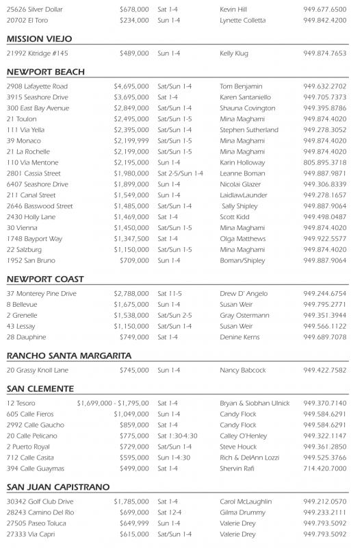 2908 Lafayette Road $4,695,000 Sat/Sun 1-4 TomBenjamin 949.632.2702 3915 Seashore Drive $3,695,000 Sat 1-4 Karen Santaniello 949.705.7373 300 East Bay Avenue $2,849,000 Sat/Sun 1-4 Shauna Covington 949.395.8786 21 Toulon $2,495,000 Sat/Sun 1-5 Mina Maghami 949.874.4020 111 Via Yella $2,395,000 Sat/Sun 1-4 Stephen Sutherland 949.278.3052 39 Monaco $2,199,999 Sat/Sun 1-5 Mina Maghami 949.874.4020 21 La Rochelle $2,199,000 Sat/Sun 1-5 Mina Maghami 949.874.4020 110 Via Mentone $2,195,000 Sun 1-4 Karin Holloway 805.895.3718 2801 Cassia Street $1,980,000 Sat 2-5/Sun 1-4 Leanne Boman 949.887.9871 6407 Seashore Drive $1,899,000 Sun 1-4 Nicolai Glazer 949.306.8339 211 Canal Street $1,549,000 Sun 1-4 LaidlawLaunder 949.278.1657 2646 Basswood Street $1,485,000 Sat/Sun 1-4 Sally Shipley 949.887.9064 2430 Holly Lane $1,469,000 Sat 1-4 Scott Kidd 949.498.0487 30 Vienna $1,450,000 Sat/Sun 1-5 Mina Maghami 949.874.4020 1748 Bayport Way $1,347,500 Sat 1-4 Olga Matthews 949.922.5577 22 Salzburg $1,150,000 Sat/Sun 1-5 Mina Maghami 949.874.4020 1952 San Bruno $709,000 Sun 1-4 Boman/Shipley 949.887.9064