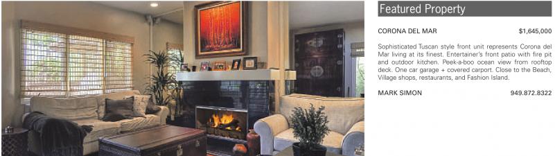 Featured Property CORONA DEL MAR $1,645,000 Sophisticated Tuscan style front unit represents Corona del Mar living at its finest. Entertainer’s front patio with fire pit and outdoor kitchen. Peek-a-boo ocean view from rooftop deck. One car garage + covered carport. Close to the Beach, Village shops, restaurants, and Fashion Island. MARK SIMON 949.872.8322