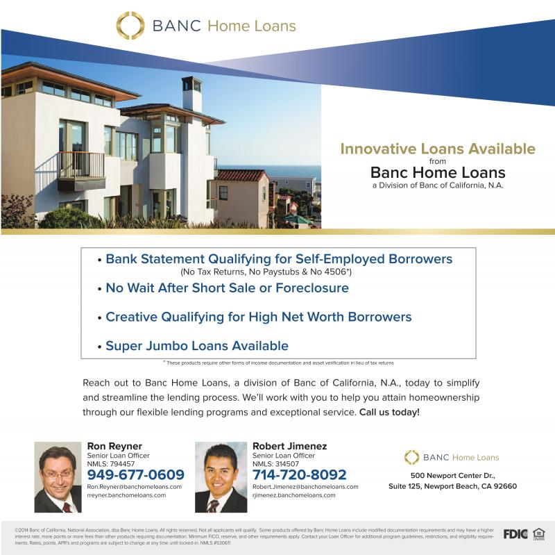 ©2014 Banc of California, National Association, dba Banc Home Loans. All rights reserved. Not all applicants will qualify. Some products offered by Banc Home Loans include modified documentation requirements and may have ahigher interest rate, more points or more fees than other products requiring documentation. Minimum FICO, reserve, and other requirements apply. Contact your Loan Officer for additional program guidelines, restrictions, and eligibility requirements. Rates, points, APR’s and programs are subject to change at any time until locked-in. NMLS #530611