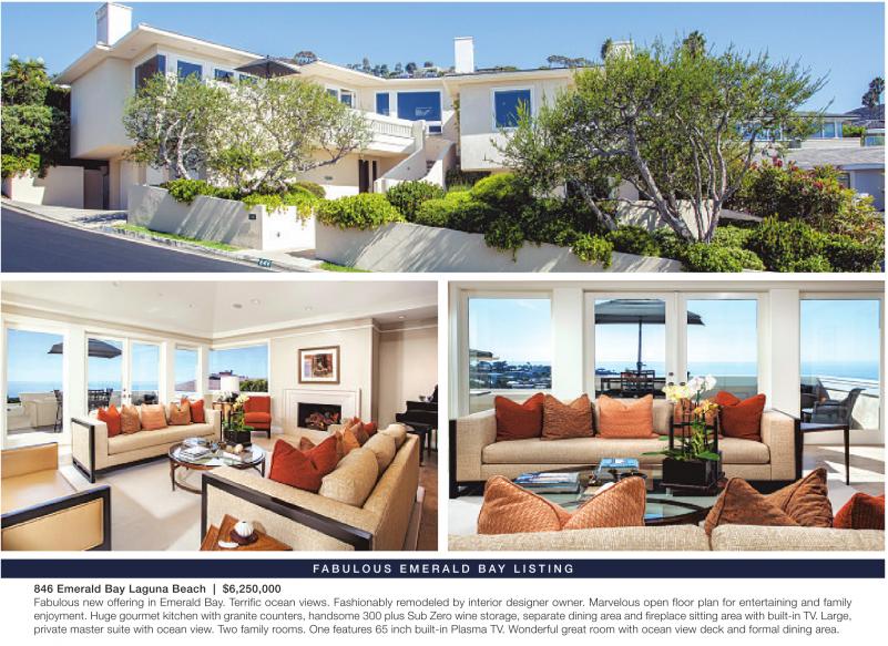 846 Emerald Bay Laguna Beach | $6,250,000 FA B U L O U S E M E R A L D B AY L I S T I N G Fabulous new offering in Emerald Bay. Terrific ocean views. Fashionably remodeled by interior designer owner. Marvelous open floor plan for entertaining and family enjoyment. Huge gourmet kitchen with granite counters, handsome 300 plus Sub Zero wine storage, separate dining area and fireplace sitting area with built-in TV. Large, private master suite with ocean view. Two family rooms. One features 65 inch built-in Plasma TV. Wonderful great room with ocean view deck and formal dining area.